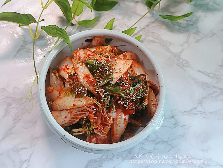 When making a fresh geotjeori, it’s best not to salt the cabbage beforehand to avoid a raw taste and maintain maximum crispness. However, the spring cabbage I acquired today has many green leaves and is slightly tougher, similar to regular cabbage. Therefore, I’ve sliced the leaves and stems diagonally into bite-sized pieces.