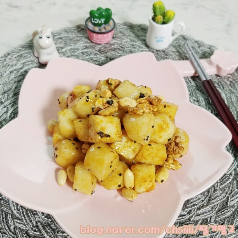 Transfer the finished Tteokgangjeong to a serving dish. You’ve now created a delightful Tteokmatang (sweet rice cake dish) with a wonderfully chewy and sweet flavor! Enjoy your delicious creation!