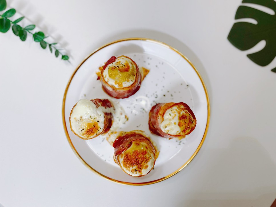 Using a round cookie cutter or a cup with a diameter of about 4-4.5 cm, cut out the center of each bread slice. (You can use the cut-out bread for other dishes!) Wrap each bread ring with bacon slices, overlapping them slightly to secure. You can lightly pan-fry the ends of the bacon to help them stick together, or use a toothpick to hold them in place.