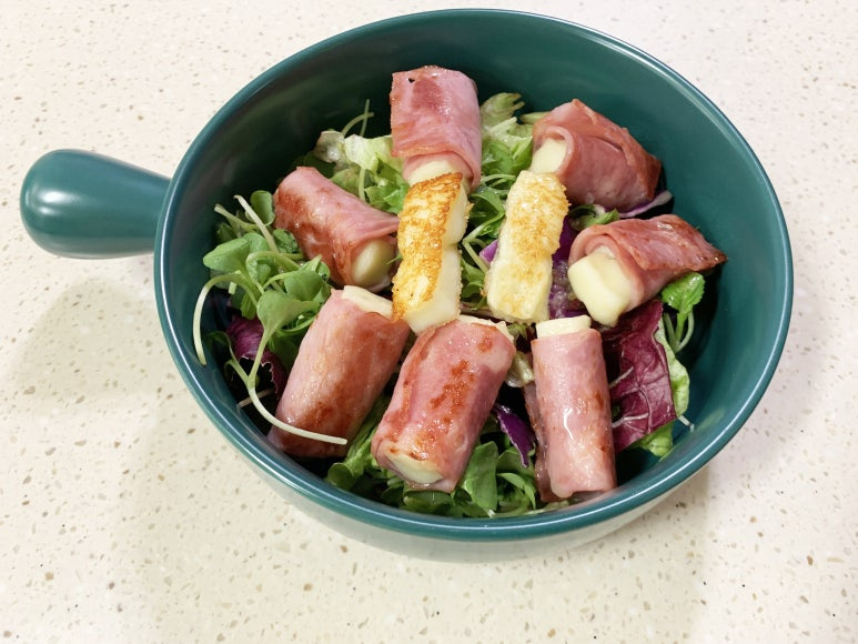 Once the bacon-wrapped cheese rolls are beautifully cooked and golden, arrange them attractively on top of the prepared salad to complete the dish. Enjoy the crispy bacon on the outside and the warm, wonderfully melted cheese filling, perfectly complemented by the fresh salad!