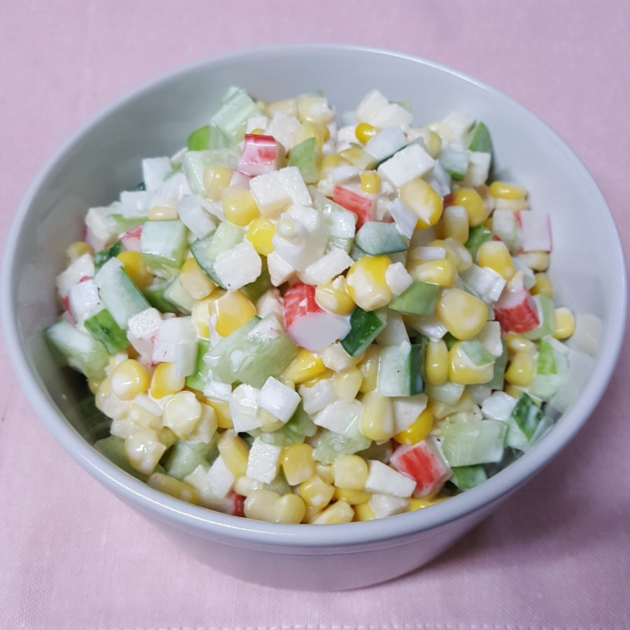 Prepare the base ingredients for the salad: corn kernels, imitation crab meat, cucumber, onion, and apple. While corn and onion are key, feel free to substitute the crab meat, cucumber, or apple with other vegetables or fruits you have on hand. Get creative and tailor it to your taste!