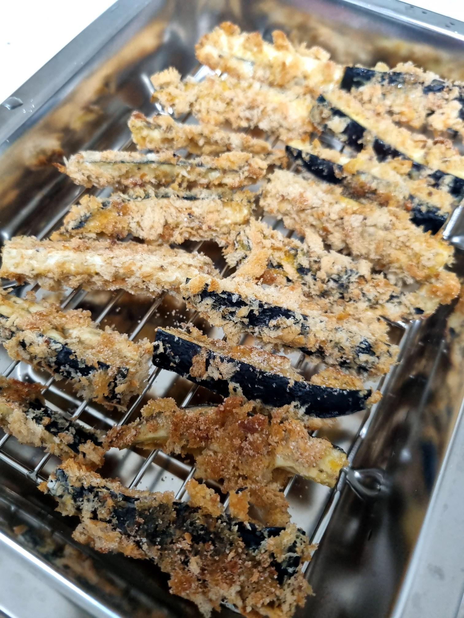 If using an oven or air fryer, lightly drizzle or spray the coated eggplant with cooking oil. This helps them achieve a golden-brown and crispy finish without deep-frying. (If pan-frying, ensure you have enough oil preheated.)