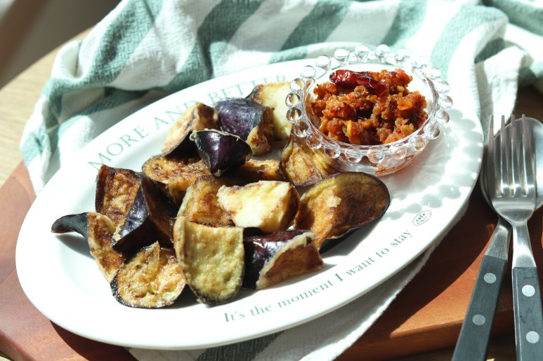 First, wash the eggplants thoroughly and pat them dry. Cut them into thick, bite-sized pieces, about 2-3 cm wide. Briefly rinse the cut eggplant pieces in cold water to remove excess moisture, then pat them dry again. Coat the eggplant pieces evenly with frying flour. This step helps the eggplant absorb less oil and become crispier.