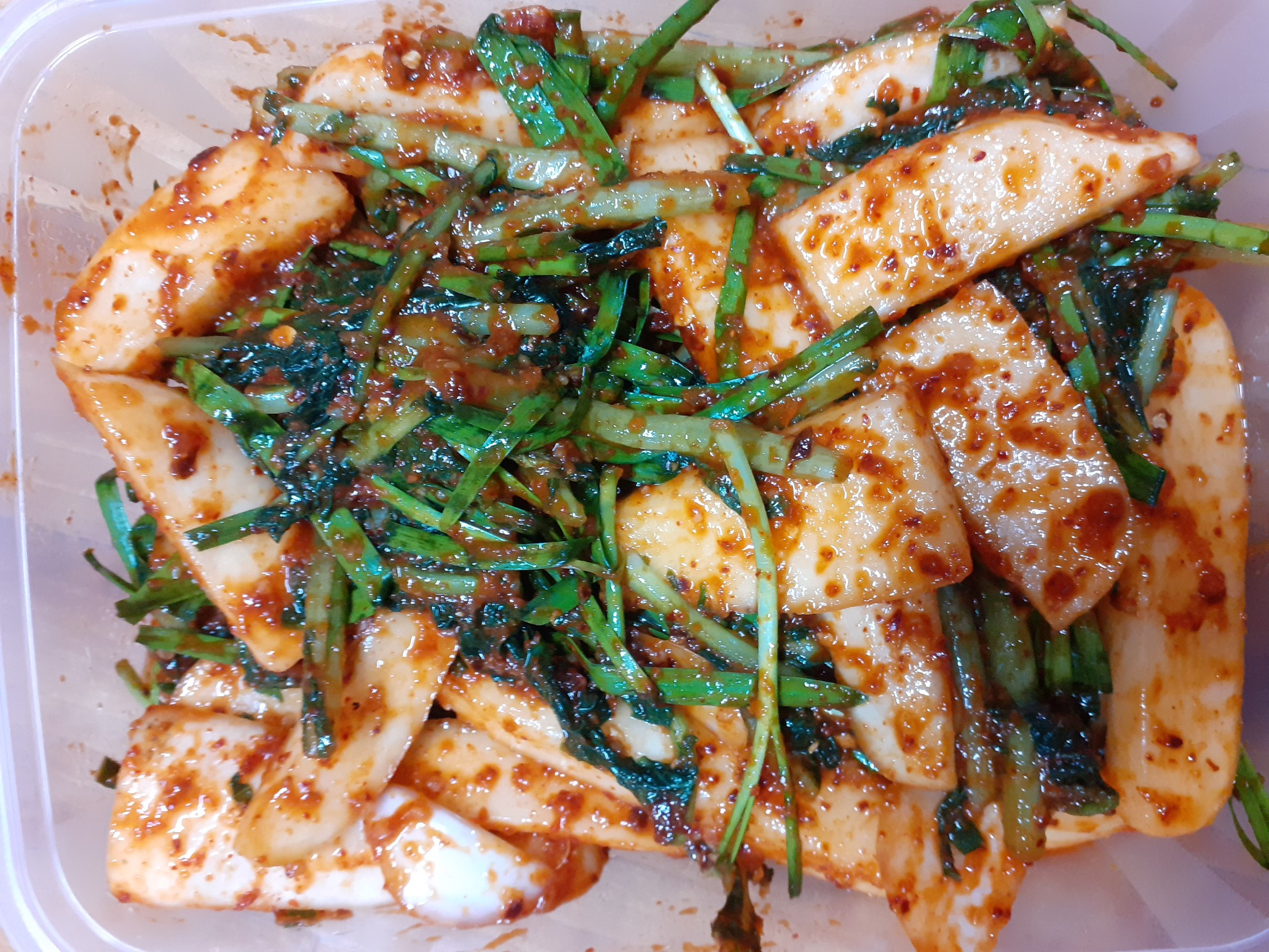 Add the chopped chives to the bowl with the drained altarimoo. Pour all the prepared seasoning paste over the radishes and chives. Gently mix with your hands, ensuring the seasoning coats everything evenly. Don’t worry if the seasoning looks a bit excessive at first; the radishes will release liquid over time, making the consistency just right.