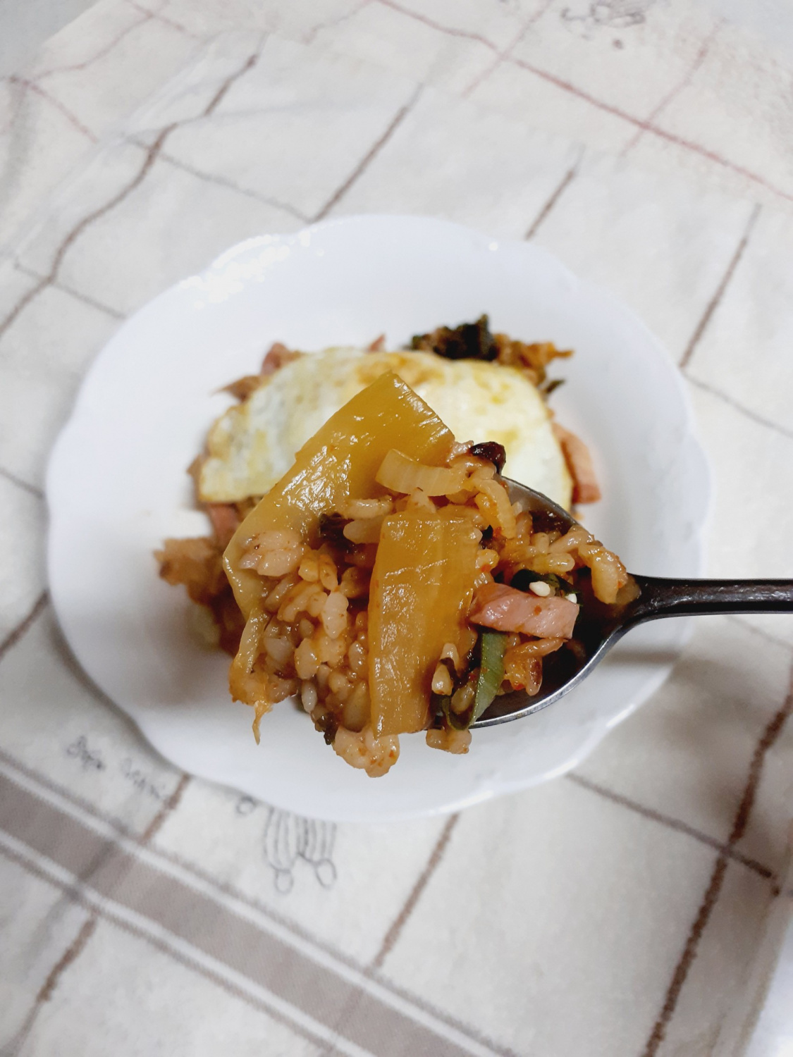 The key to great Kimchi Fried Rice is the kimchi! Prepare your ripe, sour kimchi and cut it into bite-sized pieces (about 1-2 cm). If your kimchi is too sour, you can add a little sugar.