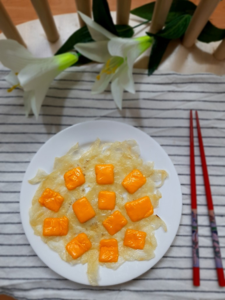 When the potato pancake is almost fully cooked, cut the 2 slices of cheese into smaller pieces and scatter them evenly over the top of the pancake. The melting cheese will add a wonderful richness and binding element.