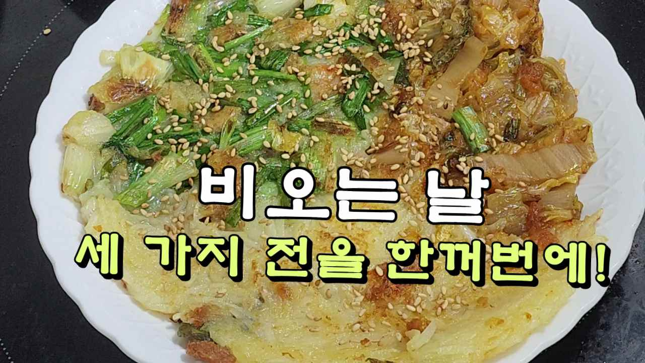 After a long dry spell, a gentle rain began to fall this evening. On days like this, savory pancakes are a must! Whether it’s kimchi jeon, potato jeon, or scallion pancake, our cravings often differ even between just two people. This recipe offers a delightful solution, allowing you to enjoy three distinct flavors in one go, perfect for a cozy, rainy day.