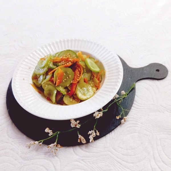 Place the sliced cucumbers in a bowl and add about 1/2 tablespoon of salt. Let them sit and pickle for 10-15 minutes until they become slightly softened. After pickling, rinse them lightly under running water and then squeeze out as much water as possible. Properly squeezing out the water is crucial to prevent sogginess and maintain a crisp texture when sautéing.