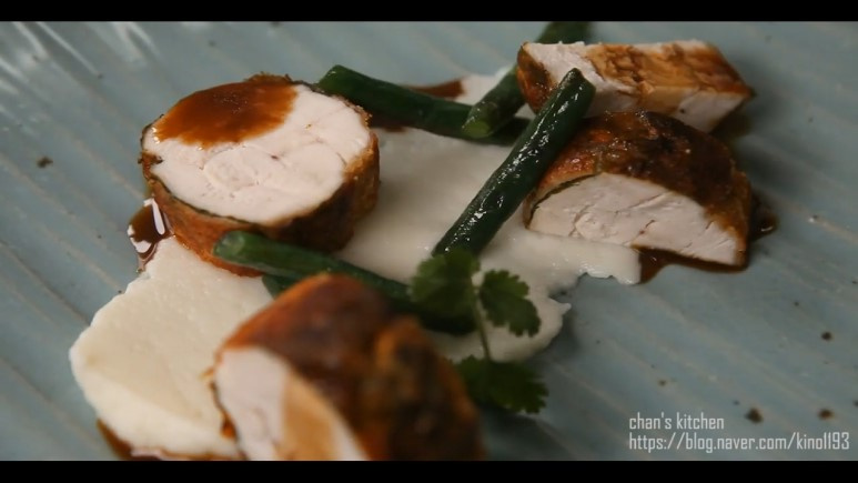 To plate, spread a generous dollop of the smooth cauliflower purée onto the plate. Arrange the sliced chicken roulade and the sautéed green beans attractively on top of the purée. Drizzle with the prepared chicken sauce and garnish with fresh cilantro leaves for a beautiful and delicious finish.