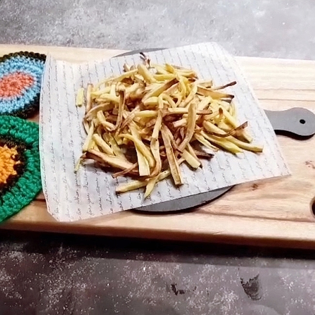 Once done, remove the sweet potato sticks from the air fryer and spread them out on a wide plate or tray to cool slightly. They might feel a bit soft while still hot, but as they cool down to room temperature, they will naturally firm up and become wonderfully crisp. This is when the satisfying ASMR crunch will begin!