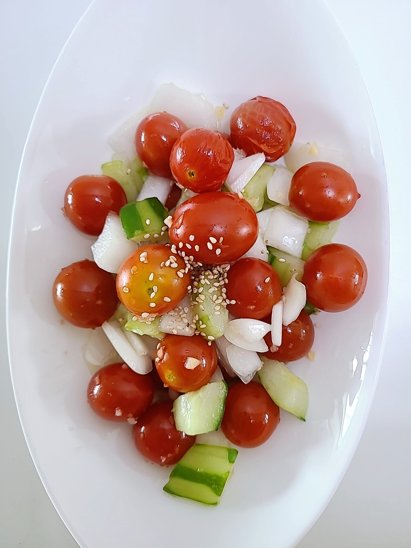 Whisk all the dressing ingredients together until well combined. (A pinch of sesame seeds can be added here for extra flavor.) Now, add the blanched cherry tomatoes, diced onion, and the squeezed cucumber to the bowl with the dressing.