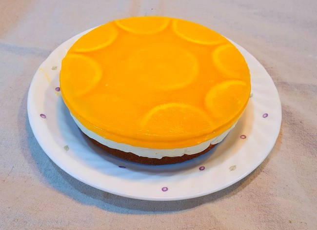 14. Carefully remove the frozen cake from the mold. (Briefly warming the sides of the mold with a warm towel or a kitchen torch can help release it). Pour the slightly thickened orange mousse over the set cake layers, smoothing the top. Chill in the refrigerator for at least 2 hours, or until the mousse is firm. Decorate with fresh orange slices or mint sprigs for a beautiful finish. Enjoy your exquisite Orange Mousse Cake!