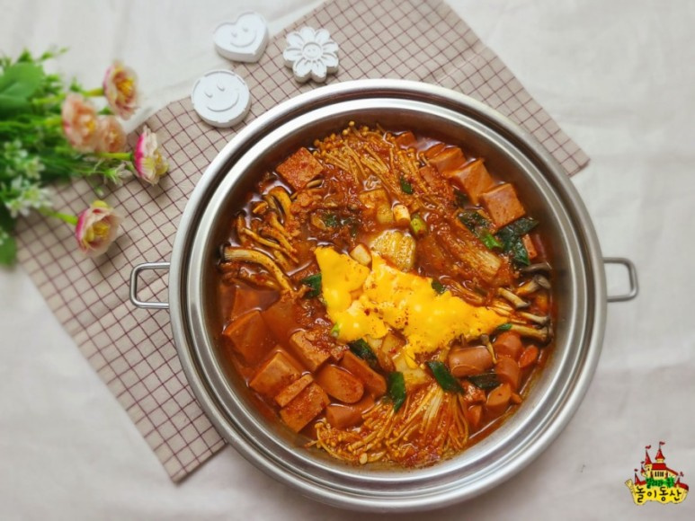 Finally, place 1 slice of cheddar cheese on top of the stew. Once the cheese melts and blends with the broth, turn off the heat. The Budae Jjigae, infused with deep flavor in every ingredient, is now ready!