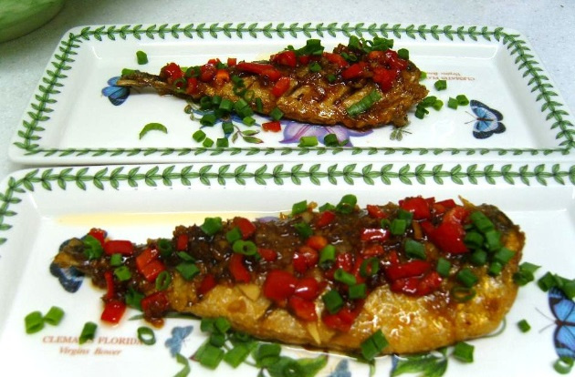 In a wide skillet or pot, heat 2 cups of vegetable oil over medium heat. Once the oil is hot, carefully place the starch-coated fish into the oil, skin-side down. Fry until the skin is golden brown and crisp. Flip and fry the other side until equally golden. Remove the fried fish and drain any excess oil on a wire rack.