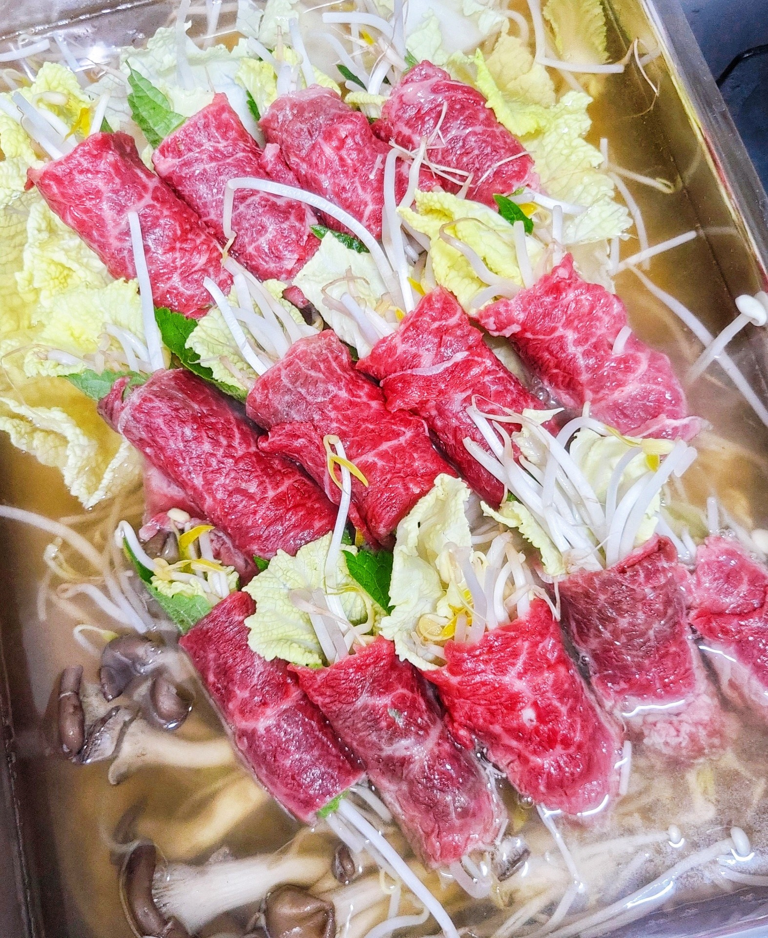 Here comes the star of today’s shabu-shabu: the beef rolls! Lay out the thinly sliced beef. Place a fresh perilla leaf on top. Arrange a portion of the prepared napa cabbage and crisp bean sprouts over the perilla leaf. Then, carefully roll the beef from one end to the other, tucking in the filling as you go. The subtle aroma of the perilla leaf will infuse into the beef and vegetables, enhancing the overall flavor.