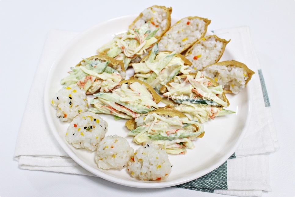 Place the prepared crab and cucumber salad generously on top of the rice-filled tofu pouches. Even if the cucumber was cut a bit thick, the taste will be fantastic!