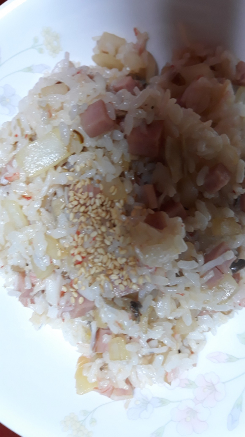 Your delicious ham and mushroom fried rice is ready! Serve it attractively in a bowl. Enjoy this satisfying meal on its own or with your favorite side dishes like kimchi. Serve hot and savor the flavors!