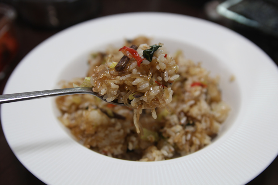 Mix the rice and japchae together and stir-fry briskly. It’s important to ensure that each grain of rice is evenly coated with the delicious japchae seasoning. Stir-fry over high heat for about 1-2 minutes.