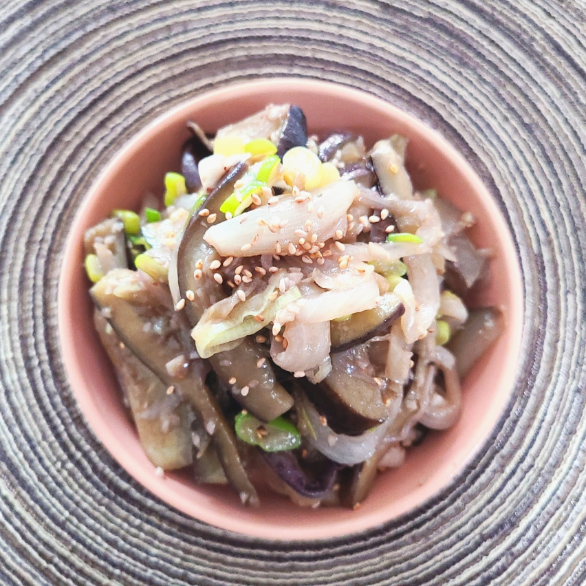 Once the garlic is fragrant, add the sliced onion and eggplant to the pan. Continue to stir-fry over medium heat, gently tossing the ingredients, until the eggplant becomes tender and slightly translucent. This usually takes about 3-4 minutes, but can vary depending on the thickness and amount of eggplant used.