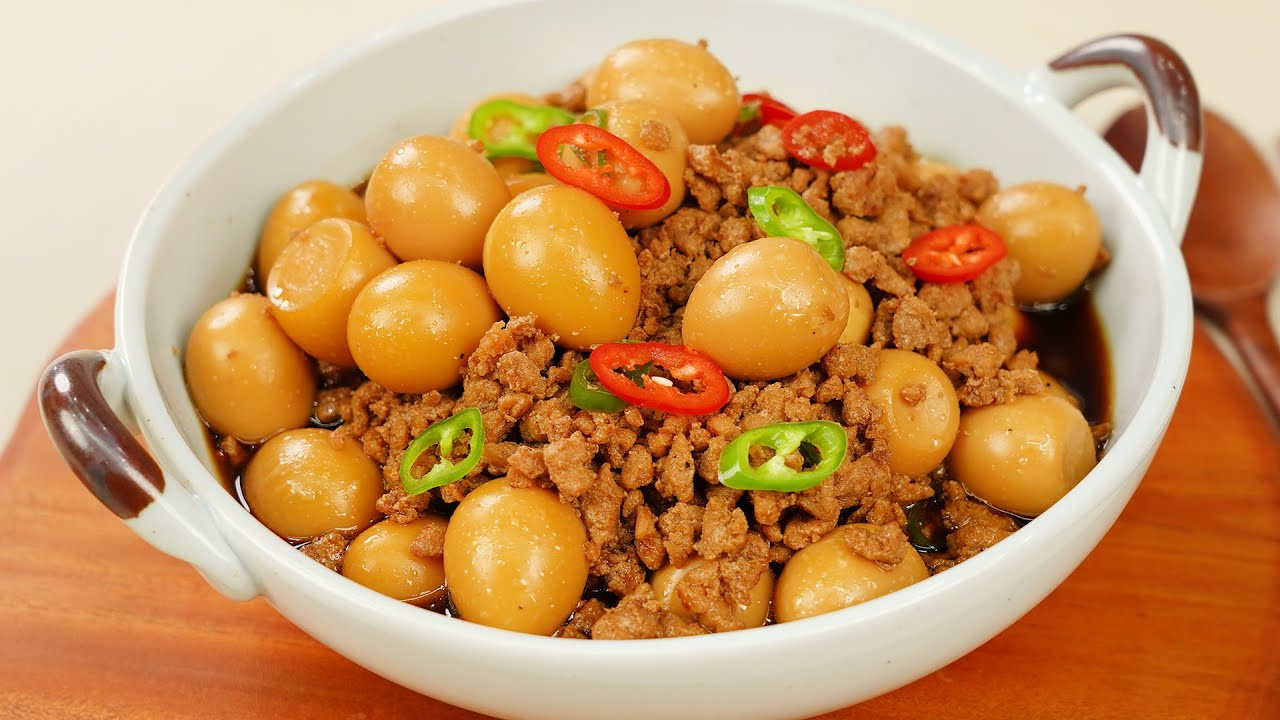 Once the pork is well-cooked, pour in the 500ml of dashi broth. Add the boiled quail eggs, 100ml soy sauce, 1 tablespoon sugar, and 1 tablespoon fish sauce. Bring the mixture to a boil over high heat, then reduce to medium heat and simmer until the quail eggs absorb the flavors. Skim off any impurities that rise to the surface during cooking.