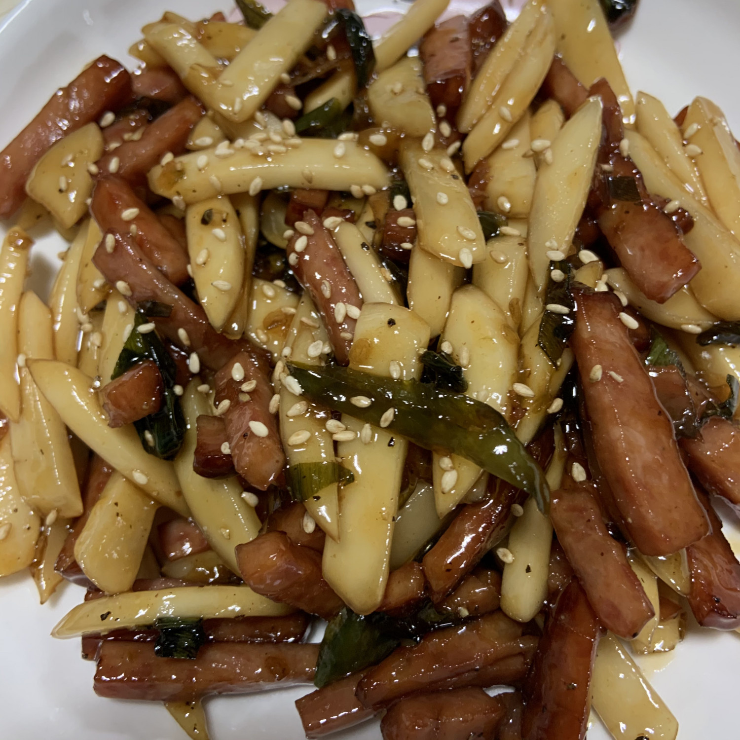 Once the fragrant green onion oil is ready, add the sliced ham to the pan. Stir-fry the ham until it becomes slightly golden brown and releases its delicious flavor. Sautéing the ham until it’s lightly browned significantly enhances the overall taste.