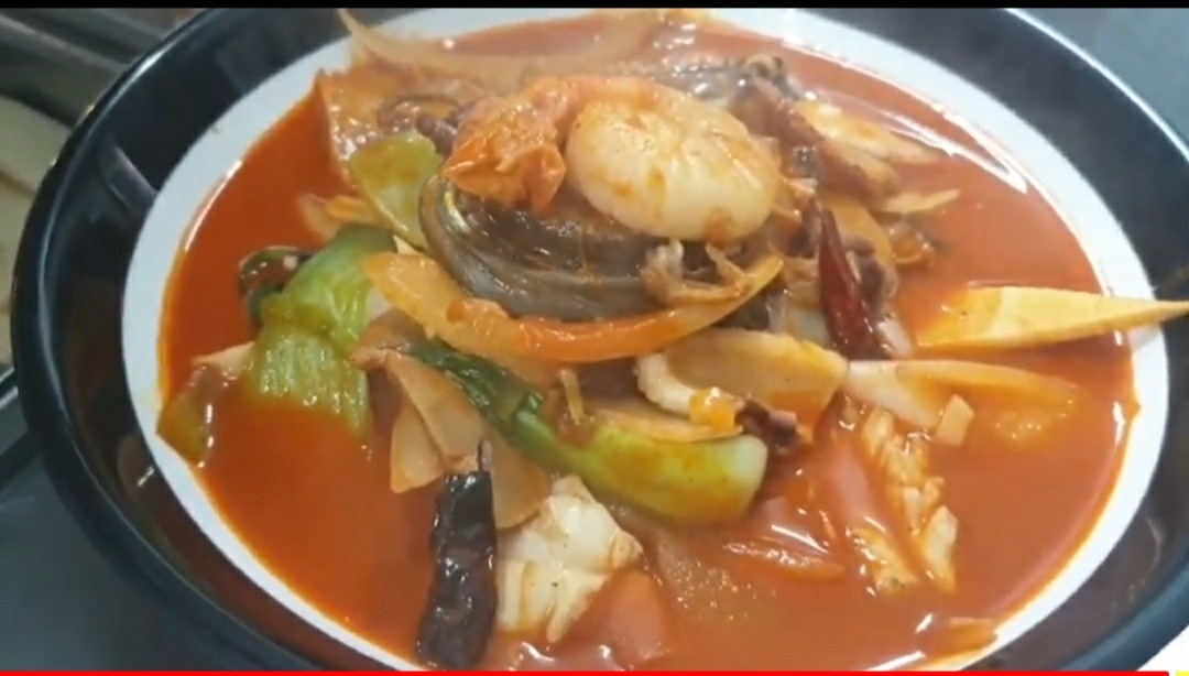This is an authentic Korean-Chinese dish, Samseon Jjamppong, made with a generous amount of premium, fresh seafood and vibrant vegetables. The broth is rich with a deep seafood flavor, making it a nutritious and luxurious noodle soup.