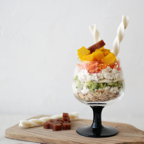 Now, it’s time to assemble your puppy parfait! Choose a clear cup or small bowl that’s easy for your dog to eat from. Start by layering the toasted oats at the bottom. Follow with a layer of mashed tofu, then the minced broccoli, followed by the banana slices, stir-fried carrots, and finally, the cubed pumpkin. Arrange these layers attractively. For the final flourish, insert a dog biscuit and a piece of jerky as a garnish. Congratulations, your adorable Puppy Parfait is ready! Serve this homemade treat with love and watch your dog’s tail wag with joy.