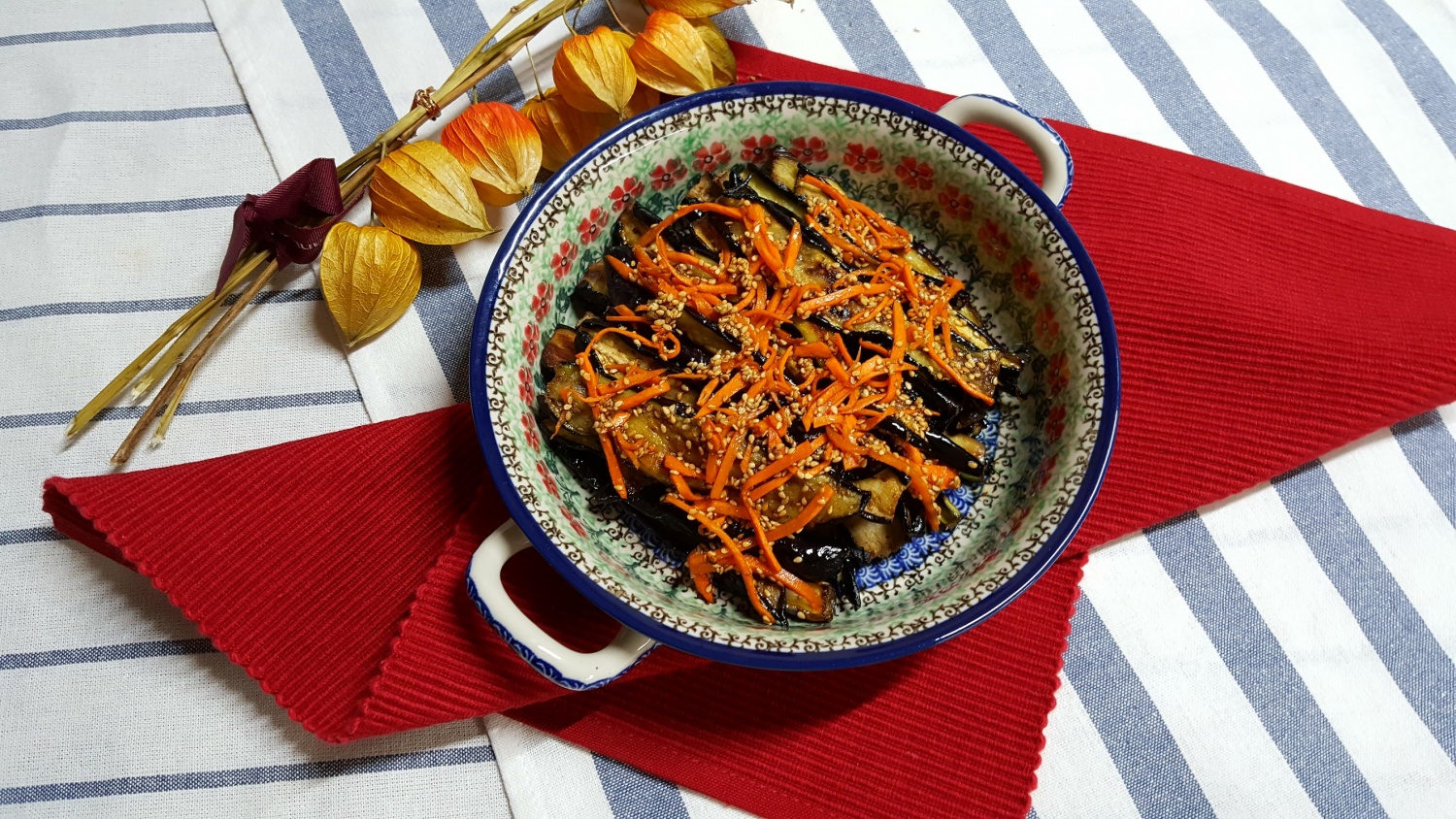 Peel and julienne the 1/2 carrot into thin strips. In a separate pan, heat 1 Tbsp of perilla oil and lightly stir-fry the julienned carrots until they are slightly softened. Once the carrots are ready, layer the pan with the pan-fried eggplant, the stir-fried carrots, and the prepared seasoning sauce. Stacking them this way allows the flavors to meld beautifully and penetrate the eggplant and carrots thoroughly.