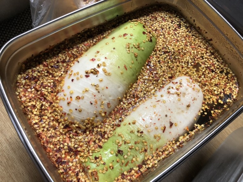 Before you begin, generously rub the radishes with coarse salt, ensuring the salt coats the entire surface evenly. Place the salted radishes snugly in a clean container. Let them cure at room temperature for two nights. It’s beneficial to turn them over once during this period.