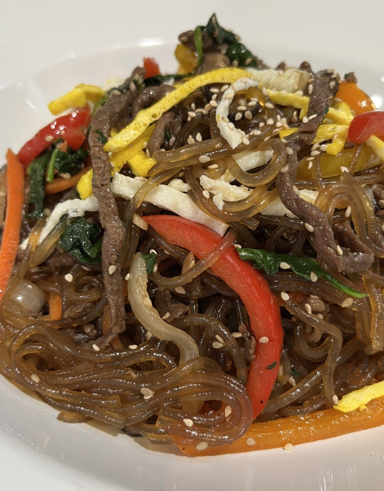 The beef, seasoned and stir-fried with a savory-sweet bulgogi sauce, significantly enhances the Japchae’s deliciousness. It’s so good, it could be a side dish for rice on its own!