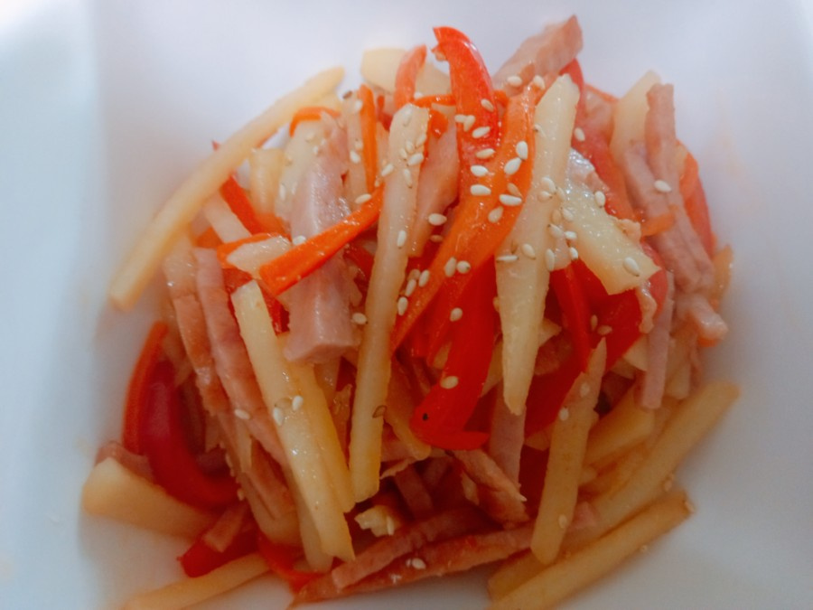 While the potatoes are soaking, prepare the other ingredients. Julienne the carrot and bell pepper into similar sizes as the potatoes. Slice the ham into bite-sized pieces. (You can also dice the ham if you prefer.)