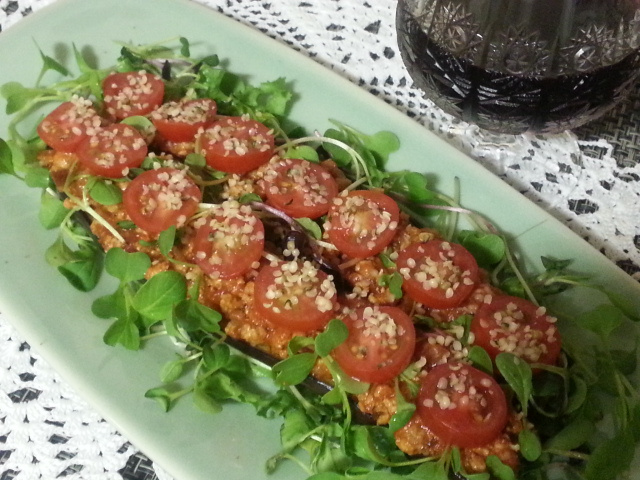 Place the nicely grilled eggplant halves on top of the baby greens. This is the star of your eggplant steak!