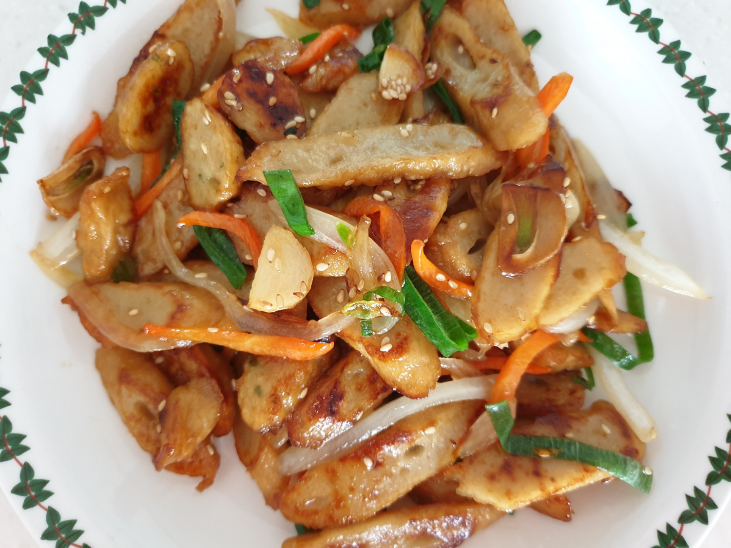We’re almost done! When the vegetables are slightly tender and everything is well mixed, add the diagonally sliced green onion and 1 tablespoon of toasted sesame seeds. Turn off the heat immediately. The residual heat will finish cooking the green onions, keeping them fresh and vibrant. Your delicious garlicky stir-fried fish cakes are ready! Serve them over warm rice.