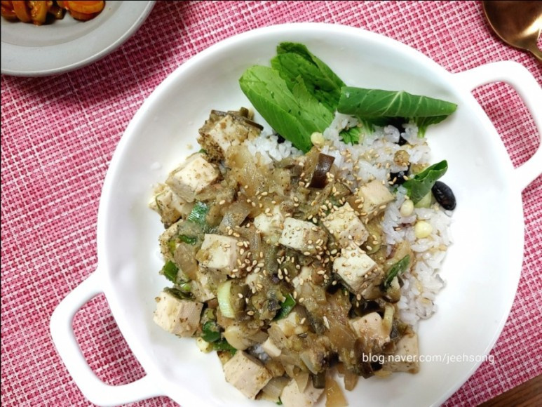 Serve the warm rice in a bowl, then generously top it with the cooked eggplant and tofu mixture. Drizzle with a little sesame oil or perilla oil and sprinkle with toasted sesame seeds for a nutty finish. Your delicious and stomach-friendly Eggplant Tofu Rice Bowl is ready!