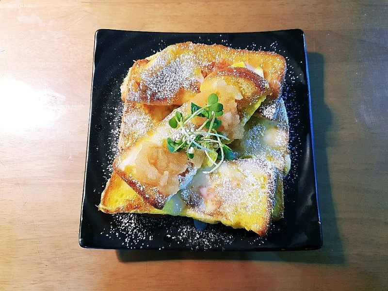 Prepare another pan over medium-low heat. Place the soaked bread slices into the pan. Cook slowly over low heat to prevent burning. Once golden brown on one side, carefully flip and cook the other side until also golden. Transfer the cooked French toast to a plate. Now, let’s prepare the delicious toppings. Stacking them in a zigzag pattern makes for a beautiful presentation.