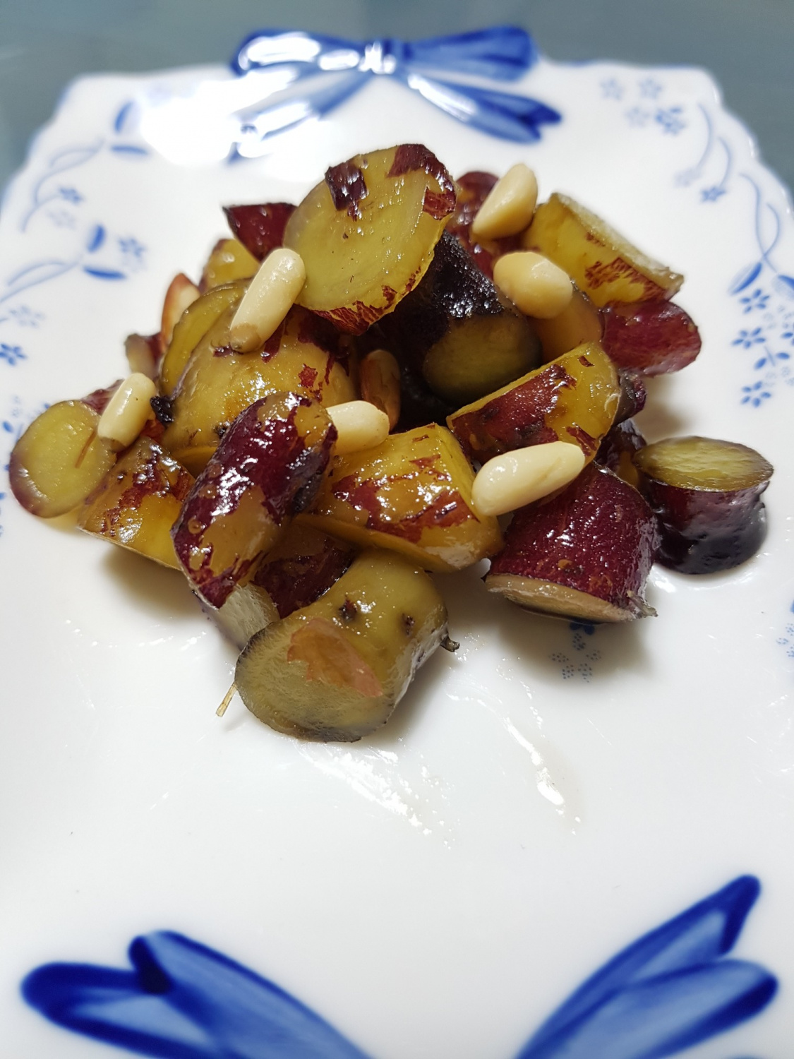 Turn off the heat. Before transferring the finished Matang to a serving dish, sprinkle 3 tablespoons of pine nuts evenly over the warm candies. If you don’t have pine nuts, toasted sesame seeds or black sesame seeds also add a lovely nutty flavor. Combining pine nuts and sesame seeds makes them even more appealing. Feel free to add other nuts as well!