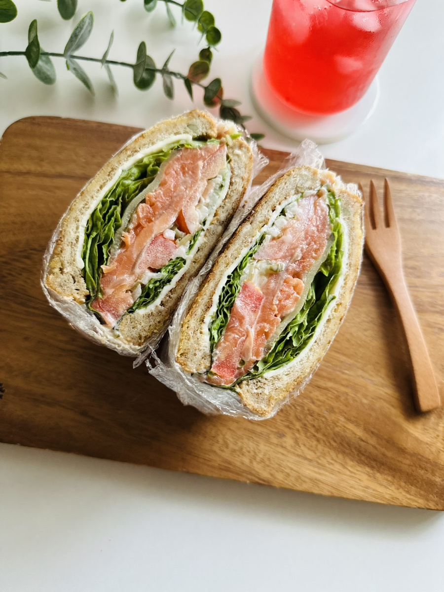 Let the wrapped sandwich rest for a moment to allow the ingredients to settle. Then, using a sharp knife, carefully cut the sandwich in half to reveal the beautiful layers. Your delicious homemade salmon sandwich is ready to enjoy!
