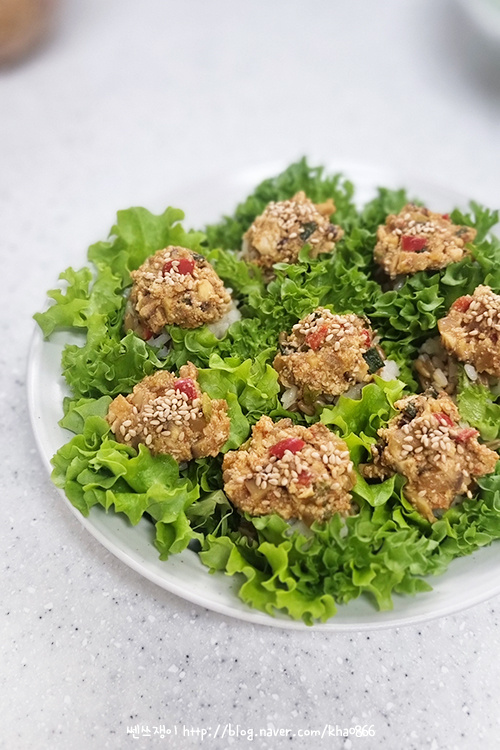Now, let’s make the ssam-bap! Wash your European lettuce or fresh lettuce leaves thoroughly and ensure they are completely dry. Using a salad spinner is highly recommended. Prepare the barley rice while warm, then shape it into small balls with your hands to form the ssam-bap base.