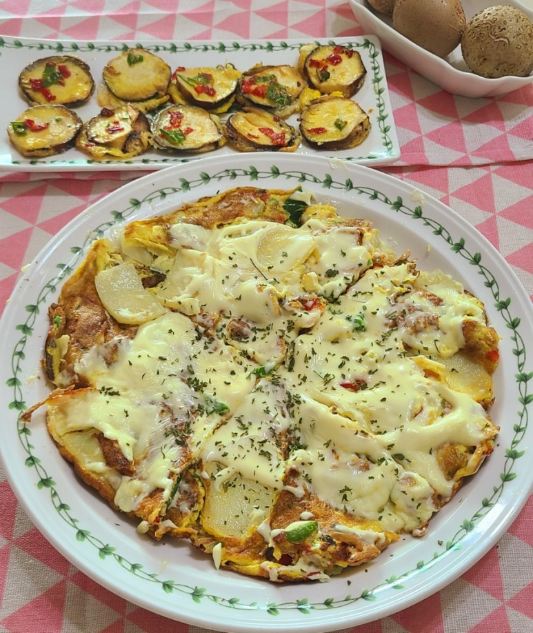 Now, evenly distribute all the prepared vegetables (chopped mushrooms, julienned carrot, chopped cabbage, bell pepper, and paprika) over the egg mixture. Cover the skillet with a lid and cook on low heat for about 7-10 minutes, or until the egg is set and the vegetables are tender.