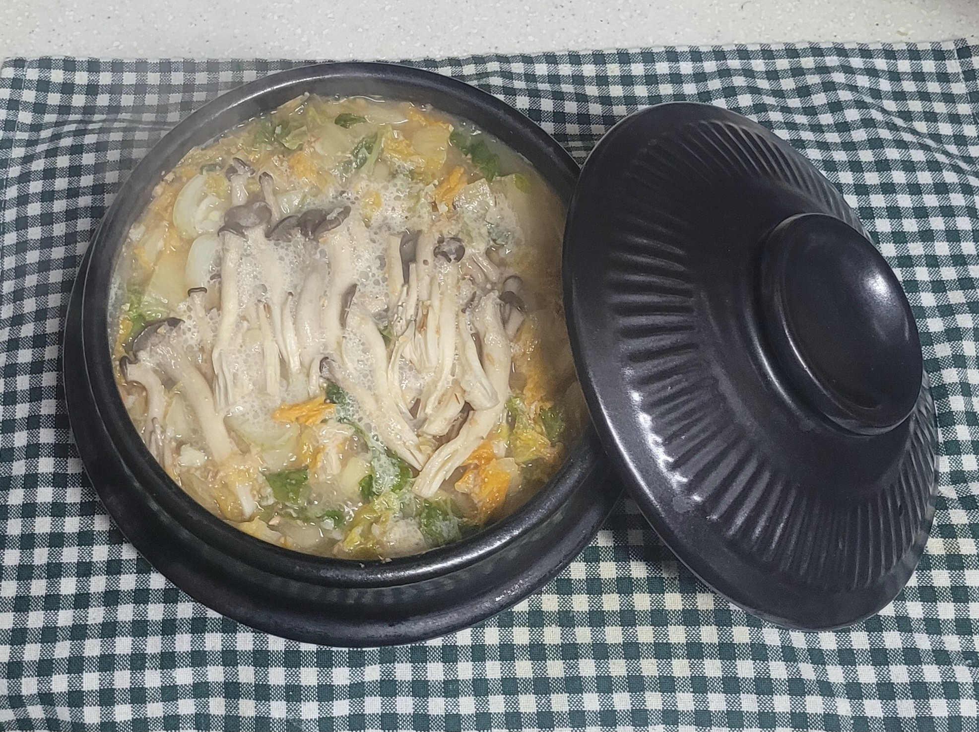 Now, prepare your earthenware pot (ttukbaegi). Place all the cut cabbage ugeoji into the pot.