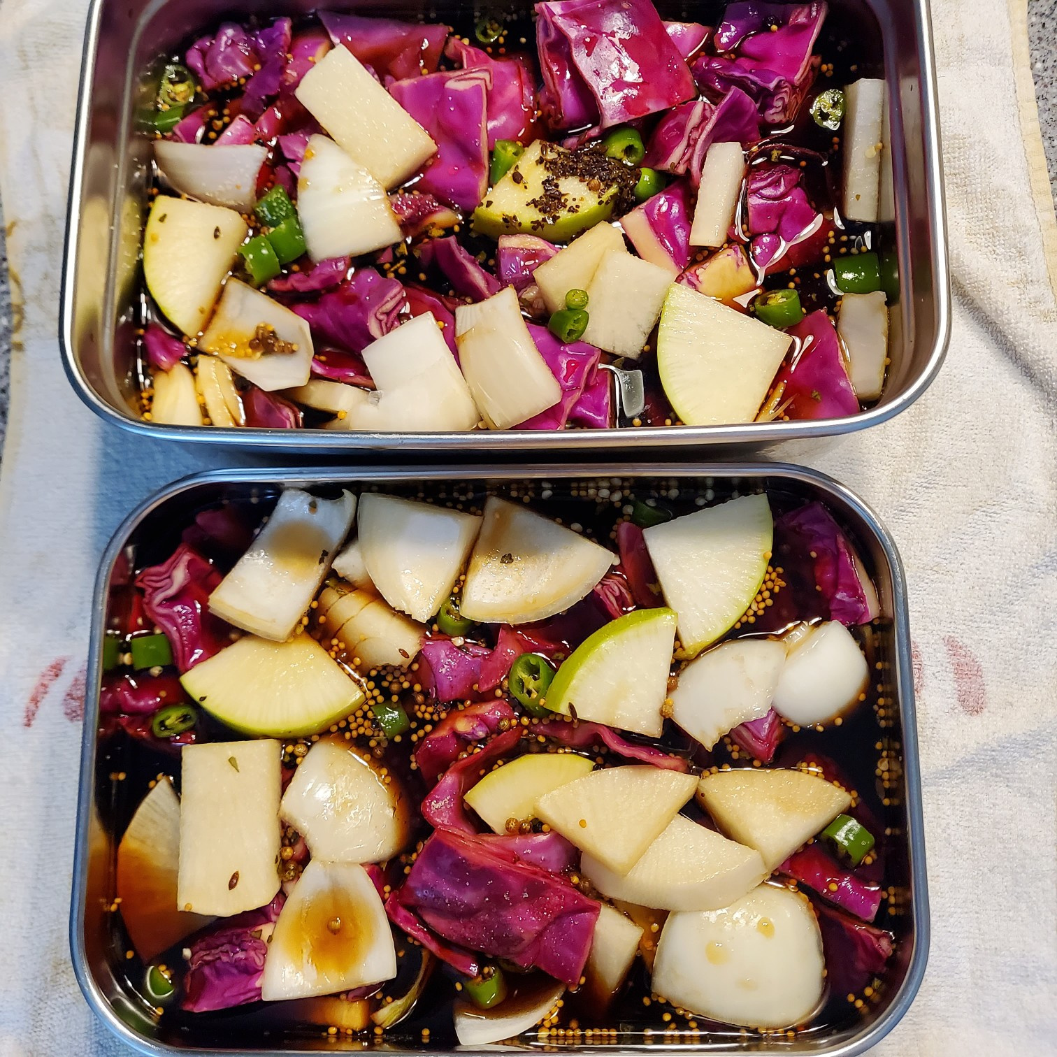 Let the well-boiled brining solution cool down slightly so it’s not too hot. Pour enough of the cooled brine into the container with the prepared red cabbage and radish so that the vegetables are just covered. This will complete your delicious assorted pickled vegetables. Pressing down the vegetables to ensure they are submerged in the brine is even better. After letting the completed Jangajji sit at room temperature for about a day to allow the brine to soak into the vegetables, transfer it to the refrigerator for cool storage. The flavor will deepen and become even more delicious over time!