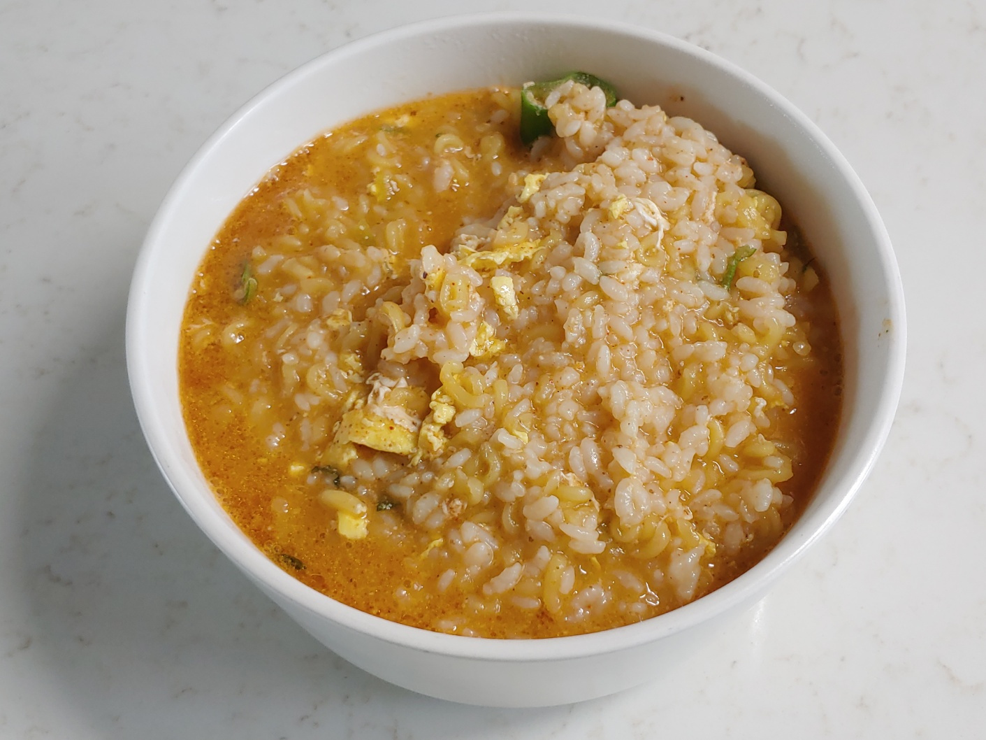 Approximately 2.5 to 3 minutes after adding the ramen, stir in the 200g of cooked rice. Break up any clumps of rice so it integrates smoothly into the porridge.