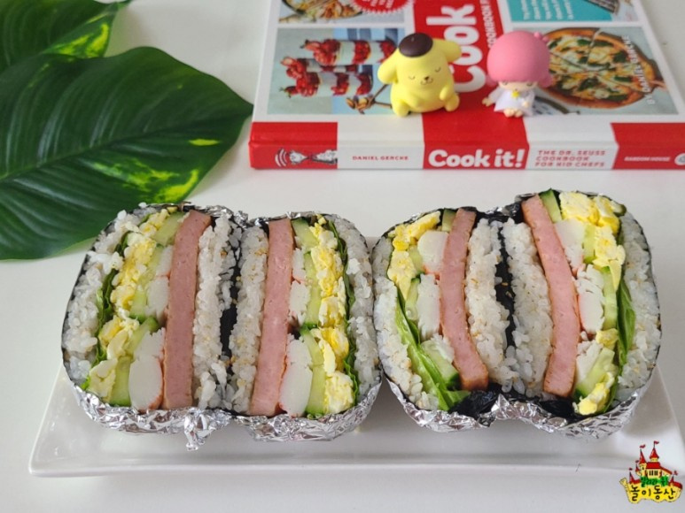 Finally, slice the wrapped Spam Onigirazu in half with a knife. Your delicious and hearty rice burger is now complete! It’s perfect for picnics, outings, or a convenient on-the-go meal.