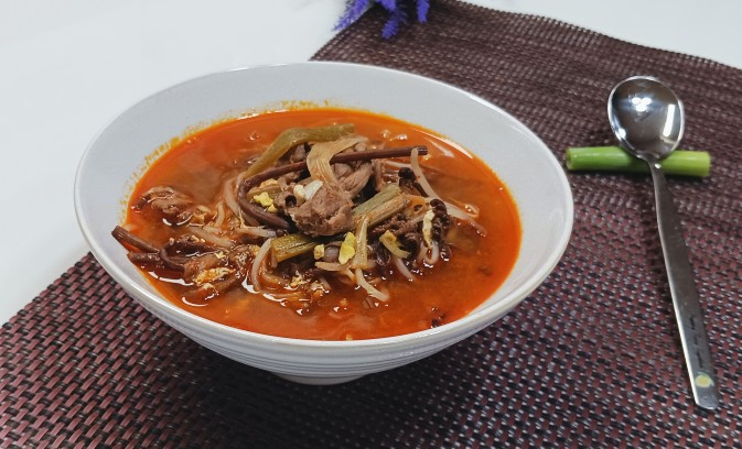 Once the chili oil has developed, pour in 1L of water and add the beef stock cube to enhance the soup’s depth of flavor.