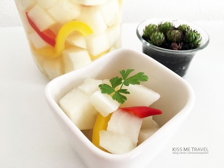 Pour the slightly cooled brine over the radish in the jar, filling it up to the neck of the container. Pouring the brine while it’s still warm helps keep the radish extra crisp. Seal the jar tightly immediately. Leave it at room temperature for about half a day, then transfer it to the refrigerator. Your delicious homemade chicken pickles are ready!
