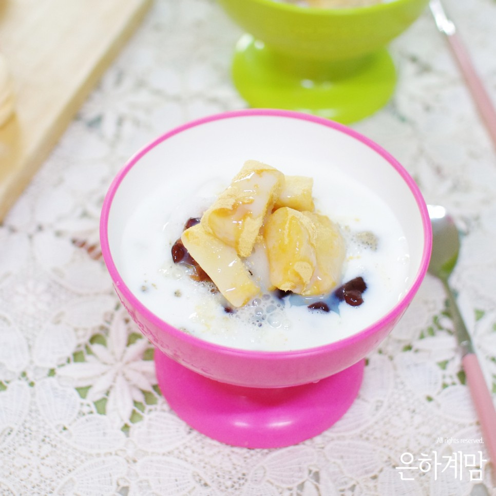 Prepare Your Toppings: Gather your favorite toppings to make your shaved ice extra special. Prepare sweet red bean paste (pat), roasted soybean flour (seoritae konggaru), condensed milk, and chewy injeolmi (rice cakes). If your children love Oreos, crushing them and sprinkling them on top adds a delightful crunch and flavor. As watermelon is in season, dicing it up and adding it provides a refreshing taste. You can create a fruit shaved ice, red bean shaved ice, Oreo shaved ice, or mango shaved ice – the possibilities are endless! Adding a scoop of vanilla ice cream is also a wonderful option.