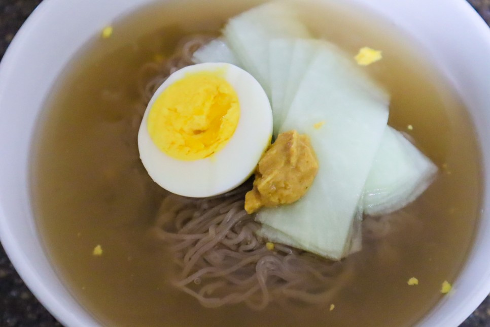 Now, it’s time to assemble everything! Drizzle the prepared mustard and some vinegar over the noodles to your taste. Finally, pour the chilled Mul Naengmyeon broth, which you’ve kept cold in the freezer, over the noodles. And voilà! Your delicious Mul Naengmyeon is complete!