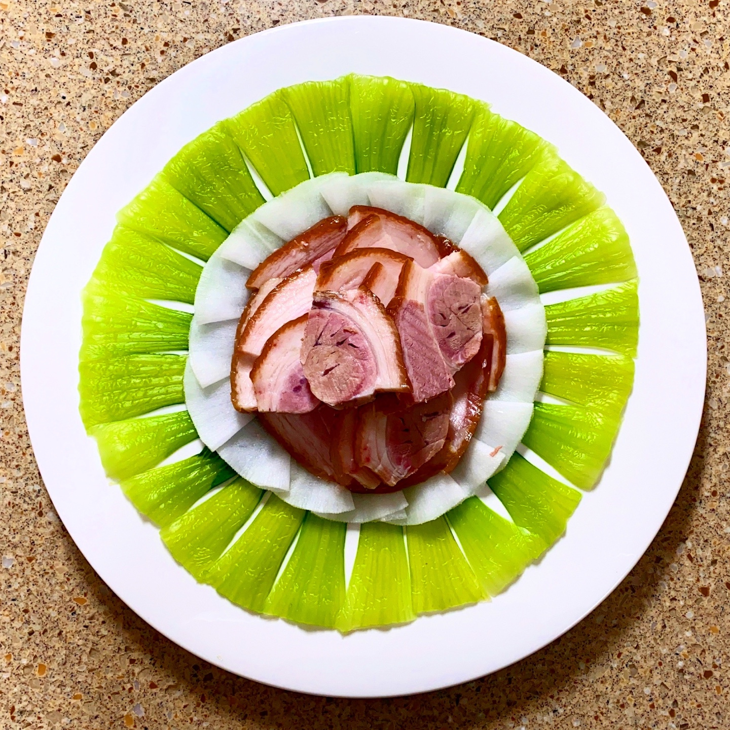 Now, artfully arrange the thinly sliced jokbal and julienned vegetables on a round serving plate. (You can also add the optional baby bok choy and pickled radish for a more elaborate presentation.)