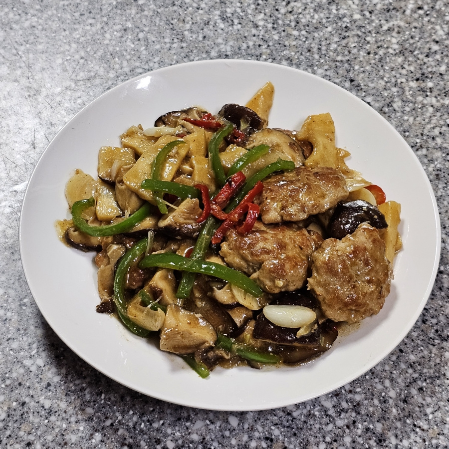 Add the chopped bell pepper, shiitake mushrooms, bamboo shoot, and red chili pepper to the pan. Stir-fry the vegetables for a minute or two until they are slightly tender-crisp, retaining their vibrant colors.