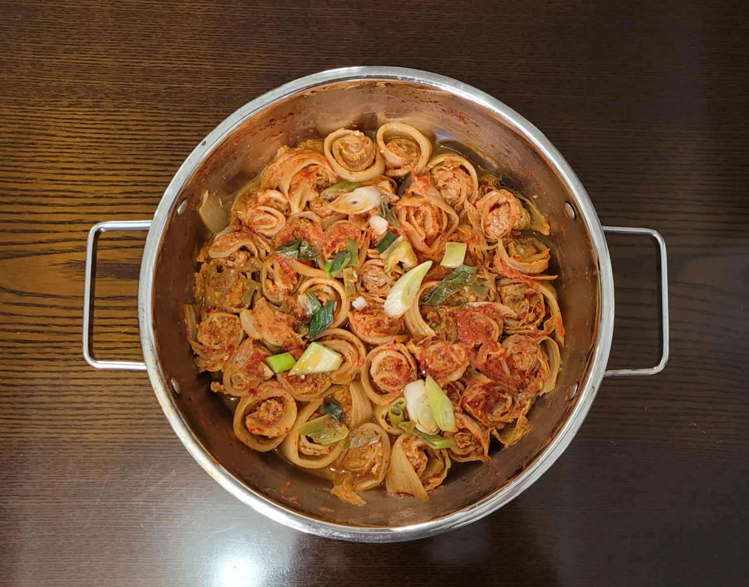Finally, garnish with diagonally sliced green onions. Let it simmer briefly to allow the flavors to meld. Your delicious Braised Pork Belly and Kimchi Rolls are ready to be enjoyed! Serve hot with steamed rice.